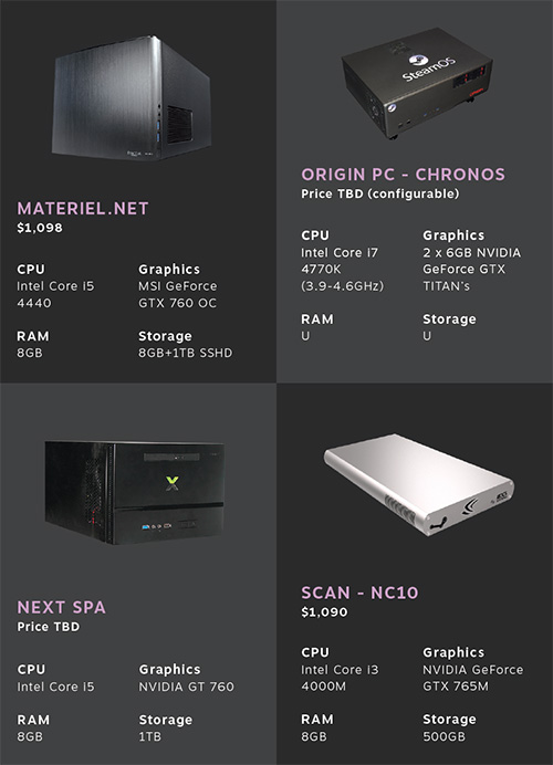 各社が構築した『Steam Machine』はそれぞれ以下の通りで、外観、スペック、価格が全て異なっています。