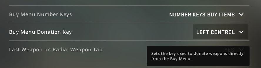 Donate weapons to teammates in need! Hold the buy menu donation key (CTRL by default) when purchasing a weapon to donate to teammates without dropping your primary weapon. You can change the “Buy Menu Donation Key” in settings.https://t.co/ZiZ13roAAQ pic.twitter.com/2IlGNVNzC8— Yossy (@YossyFPS) December 18, 2020
