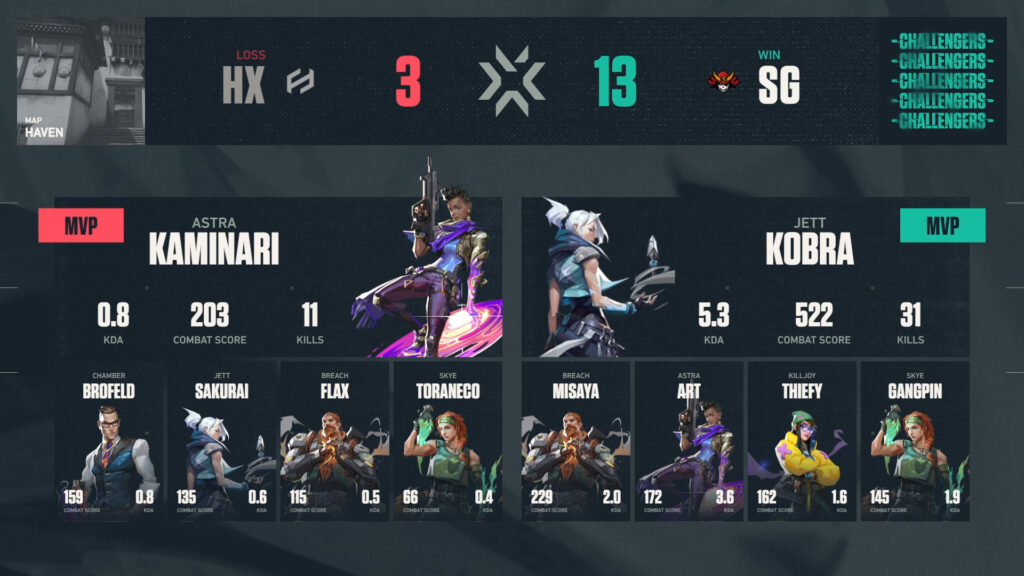 1マップ目HAVENはSG kobra選手のジェット、2マップ目ASCENTはHX Brofeld選手のレイナが存在感を見せつけ、それぞれ大差をつけて勝利。
