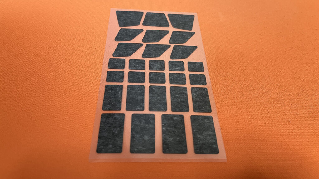 パッケージを開けると、シート状になったグリップテープが出てきます。複数の形状で5種類、計28枚。
