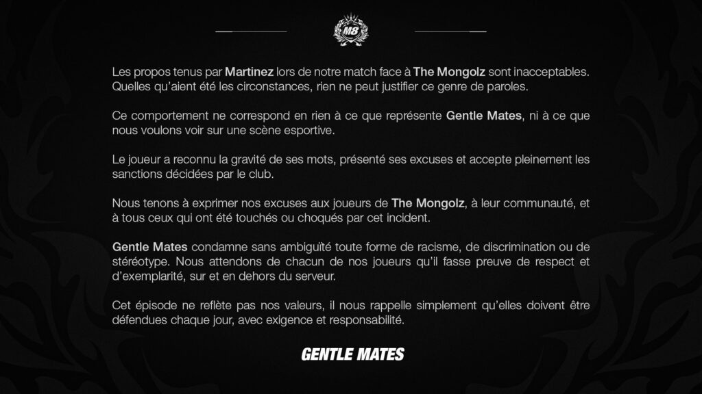 「Martinez選手が『The MongolZ』との試合中に発した言葉は容認できるものではありません。