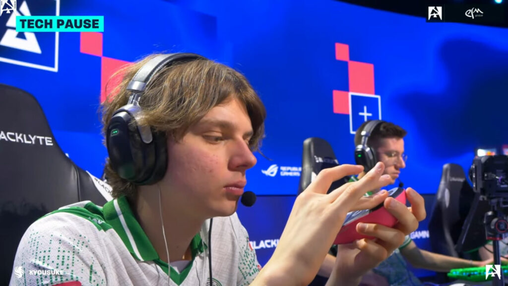 YEKINDAR選手は、m0NESEY選手のAWPにやられた後にマウスを叩きつけ、これによりマウスが反応しなくなってしまいテックポーズとなりました。