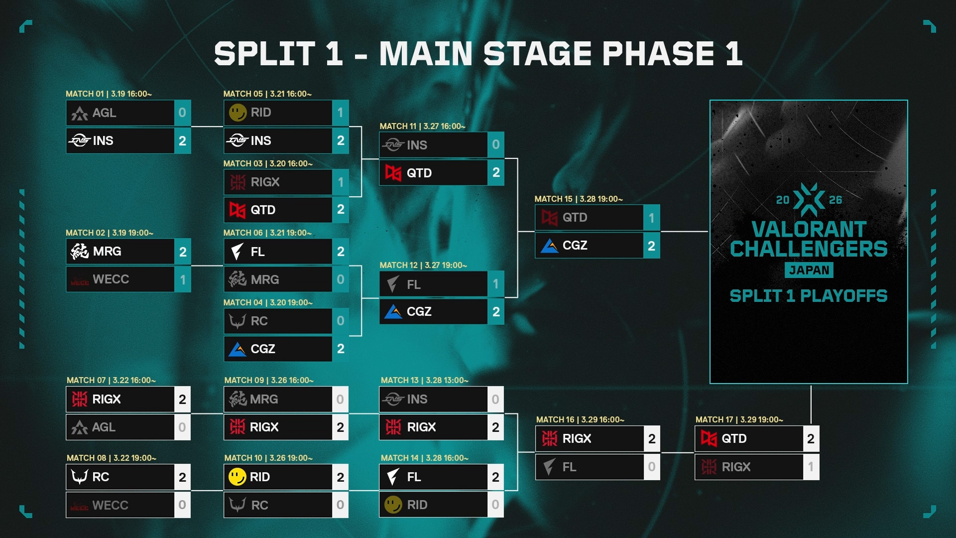 「QT DIG∞」が『VALORANT Challengers Japan 2026 Split 1 Main Stage Phase 1』を2位で通過し、プレーオフ出場権を獲得しました。